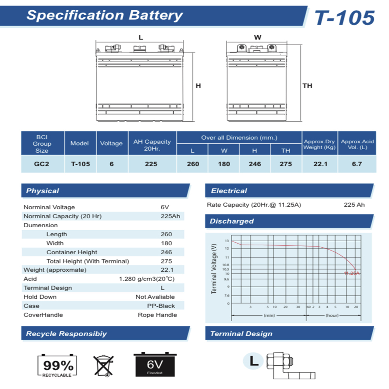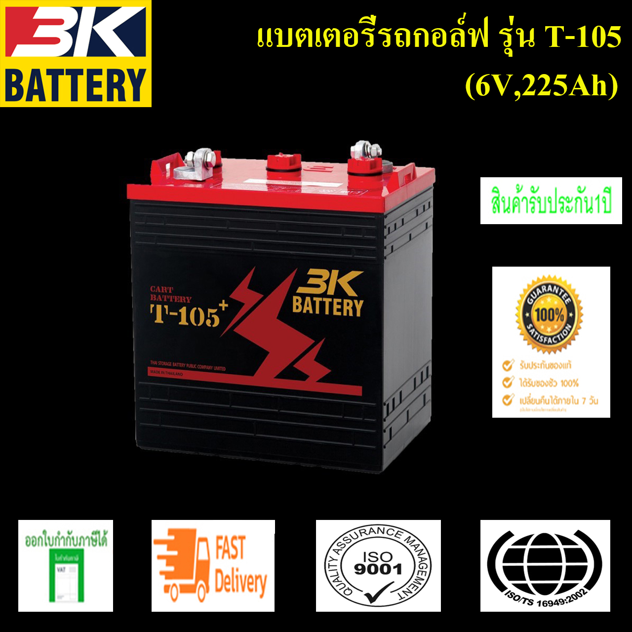แบตเตอรี่รถกอล์ฟ ยี่ห้อ 3K รุ่น T-105 (6V 225Ah) Golf Cart Battery
