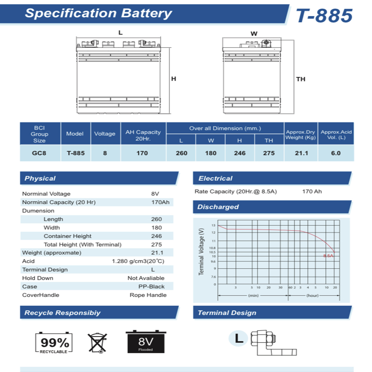 จ่ายกระแสไฟฟ้าได้นานและต่อเนื่อง ดีกว่าแบตเตอรี่รถยนต์ทั่วไป แผ่นธาตุตะกั่วของแบตเตอรี่มีขนาดใหญ่และหนากว่า ซึ่งจะลดปัญหาแผ่นธาตุกร่อนดีกว่าแบตเตอรี่รถยนต์ การระเหยของน้ำกลั่นจะน้อยกว่าแบตเตอรี่ในประเภทรถยนต์ ให้กำลังได้มาก และอายุการใช้งานที่ยาวนานกว่าแบตเตอรี่รถยนต์ แรงดันไฟฟ้า Voltage Volt 8 กระแสไฟฟ้า Capacity at 5hr Ah 120 กระแสไฟฟ้า Capacity at 20hr Ah 170 Reserve Capacity Minutes At 75 amps 75 Initial charge before use Charging Rate (Ah) 15 Charging Time (Hrs) 10 Overall Dimension (mm.) Length ยาว (มม.) 260 Width กว้าง (มม.) 180 Heigth สูง (มม.) 245 Total Height สูงรวมขั้ว 290 น้ำหนัก Approx with Acid Kg 28.8
