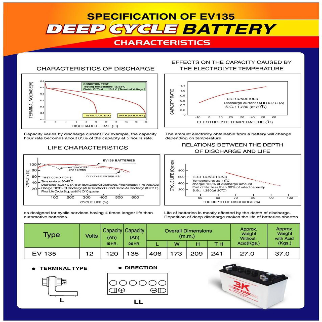 รายละเอียด แบตเตอรี่3K EV135 12โวลท์ 135แอมป์ สามารถใช้งานได้หลากหลายทั้งในงานรถกอล์ฟ รถไฟฟ้าและระบบโซล่าเซลล์ เป็นแบตประเภท Deep Cycle Battery แผ่นธาตุหนา ทนทาน. คุณสมบัตของแบตเตอรี่