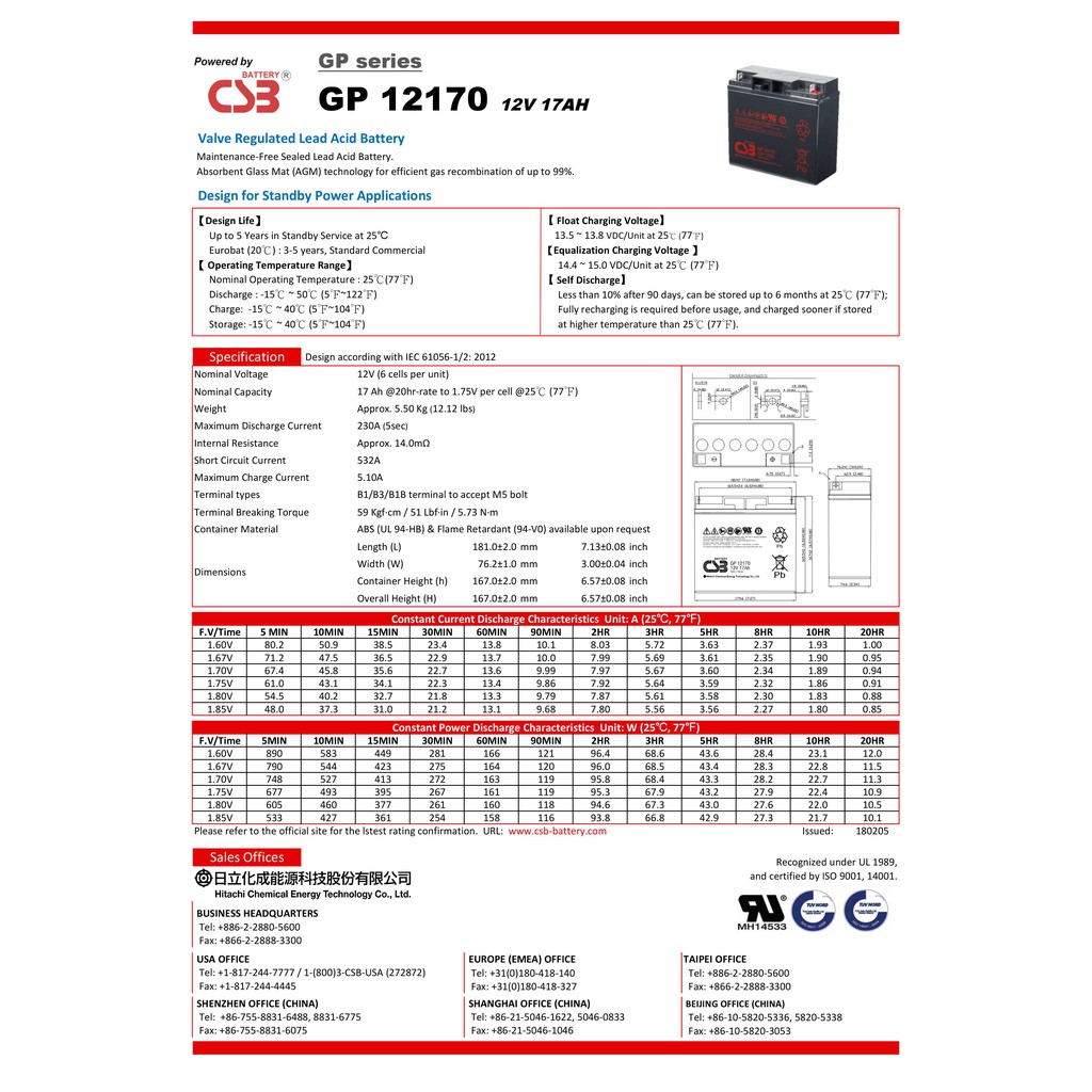 1.ขนาด กว้าง 7.62, ยาว 18.1, สูง 16.55 (ซม) 2.แบตเตอรี่ รุ่น GP12170 (12V 17AH) ระบบสำรองไฟฟ้า เป็นแบต VRLA ("การใช้งานสแตนด์บาย" - พลังงานสำรอง: ส่วนใหญ่ใช้สำหรับไฟฉุกเฉินหรือUPSและอื่นๆ เพื่อหลีกเลี่ยงความเสียหายในอนาคตที่อาจเกิดจากไฟดับทันที) แบตแห้ง 3.ควรเก็บแบตไว้ในอุณภูมิ 25 จะยิ่งทำให้แบตมีอายุการใช้งานที่ยาวนานมากยิ่งขึ้น 4.รับประกันแบต 1ปี (กรณีที่แบตเสียเองที่ไม่ได้เกิดจากการทำเสียเองของตัวลูกค้า) 5.อายุการใช้งานสูงถึง 5 ปี สินค้าของแท้ 100%