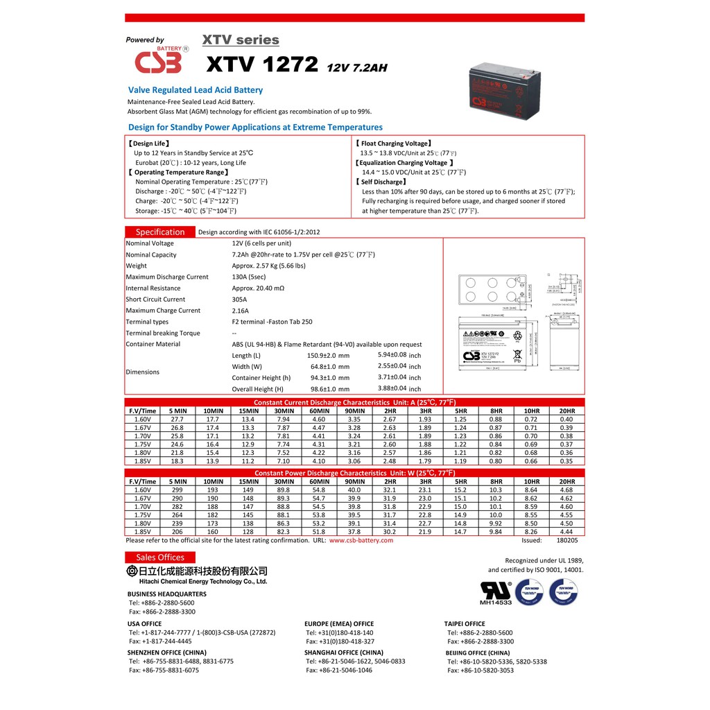 1.ขนาด กว้าง 6.48, ยาว 15., สูง 9.86(ซม) 2.แบตเตอรี่ รุ่น XTV1272 ( 12V,(6 cells per unit) ระบบสำรองไฟฟ้า เป็นแบต VRLA ("การใช้งานสแตนด์บาย" - พลังงานสำรอง: ส่วนใหญ่ใช้สำหรับไฟฉุกเฉินหรือUPSและอื่นๆ เพื่อหลีกเลี่ยงความเสียหายในอนาคตที่อาจเกิดจากไฟดับทันที) แบตแห้ง 3.ควรเก็บแบตไว้ในอุณภูมิ 25 จะยิ่งทำให้แบตมีอายุการใช้งานที่ยาวนานมากยิ่งขึ้น 4.รับประกันแบต 1ปี (กรณีที่แบตเสียเองที่ไม่ได้เกิดจากการทำเสียเองของตัวลูกค้า) 5.อายุการใช้งานสูงถึง 10-12 ปี หากท่านต้องการอัพเกรดให้ UPS ของท่านจ่ายไฟได้นานขึ้น Battery Shop ขอแนะนำ CSB XTV1272 ( 12V,(6 cells per unit) คุณภาพดี