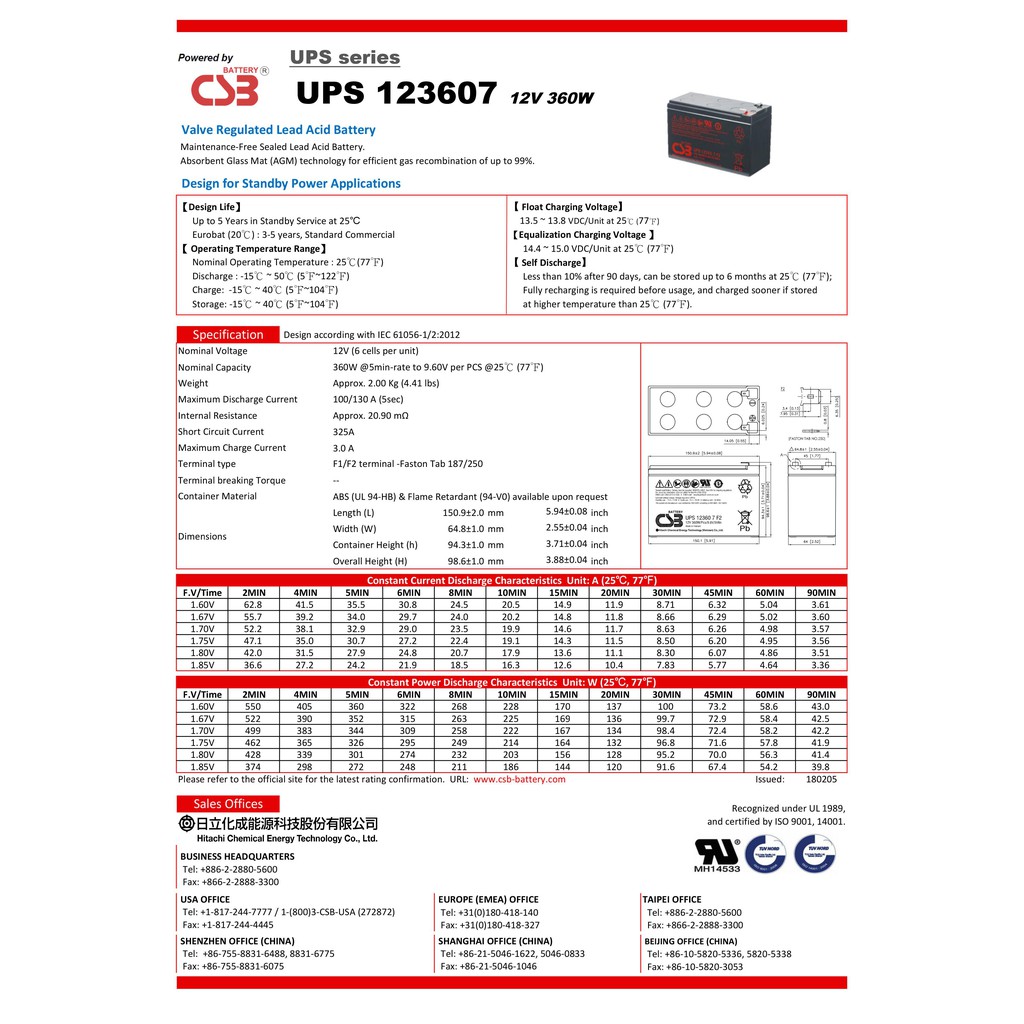 1.ขนาด กว้าง 6.5, ยาว 15.1, สูง 9.4 (ซม) 2.แบตเตอรี่ รุ่น UPS123607 F2( 12V, 360W ) ระบบสำรองไฟฟ้า เป็นแบต VRLA ("การใช้งานสแตนด์บาย" - พลังงานสำรอง:ส่วนใหญ่ใช้สำหรับไฟฉุกเฉินหรือUPSและอื่นๆ เพื่อหลีกเลี่ยงความเสียหายในอนาคตที่อาจเกิดจากไฟดับทันที) แบตแห้ง 3.ควรเก็บแบตไว้ในอุณภูมิ 25 จะยิ่งทำให้แบตมีอายุการใช้งานที่ยาวนานมากยิ่งขึ้น 4.รับประกันแบต 1ปี (กรณีที่แบตเสียเองที่ไม่ได้เกิดจากการทำเสียเองของตัวลูกค้า) 5.อายุการใช้งานแบตยาวถึง 5 ปี หากท่านต้องการอัพเกรดให้ UPS ของท่านจ่ายไฟได้นานขึ้น Battery Shop ขอแนะนำ CSB UPS123607 ( 12V, 360W ) คุณภาพดี สินค้าของแท้ 100%