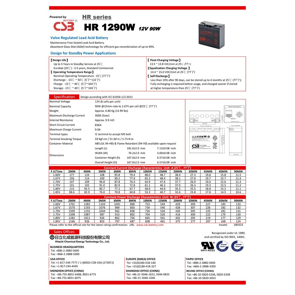 1.ขนาด กว้าง 7.62, ยาว 18.1, สูง 16 (ซม) 2.แบตเตอรี่ รุ่น HR1290W ( 12V, 90W, 22.5AH ) ระบบสำรองไฟฟ้า เป็นแบต VRLA ("การใช้งานสแตนด์บาย" - พลังงานสำรอง: ส่วนใหญ่ใช้สำหรับไฟฉุกเฉินหรือUPSและอื่นๆ เพื่อหลีกเลี่ยงความเสียหายในอนาคตที่อาจเกิดจากไฟดับทันที) แบตแห้ง 3.ควรเก็บแบตไว้ในอุณภูมิ 25 จะยิ่งทำให้แบตมีอายุการใช้งานที่ยาวนานมากยิ่งขึ้น 4.รับประกันแบต 1ปี (กรณีที่แบตเสียเองที่ไม่ได้เกิดจากการทำเสียเองของตัวลูกค้า) 5.อายุการใช้งานแบตยาวถึง 10 ปี หากท่านต้องการอัพเกรดให้ UPS ของท่านจ่ายไฟได้นานขึ้น Battery Shop ขอแนะนำ CSB HR1290W ( 12V, 90W, 22.5AH ) คุณภาพดี