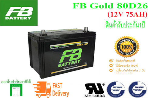 แบตเตอรี่รถยนต์ FB Gold 80D26 SMF ด้วยคุณสมบัติที่โดนเด่นที่มีความจุของแผ่นธาตุ 15 แผ่นและ CCA เป็น 580 กำลังไฟแรง 75 แอมป์ เป็นแบตเตอรี่แห้งอีกหนึ่งความภูมิใจของ FB Battery ที่ผลิตขึ้นมาเพื่อรถสำหรับเครื่องยนต์ขนาด 2,000 ซีซี.ขึ้นไป เป็นแบตเตอรี่ FB ที่ไม่ต้องดูแล ไม่ต้องเติมน้ำกลั่น ด้วยฝา 3 ชั้นป้องกันน้ำกรดรั่วซึม ออกแบบโครงแผ่นธาตุด้วยระบบ CAE (Computer Aid Engineering) ช่วยให้ส่งผ่านกระแสไฟได้ดียิ่งขึ้น