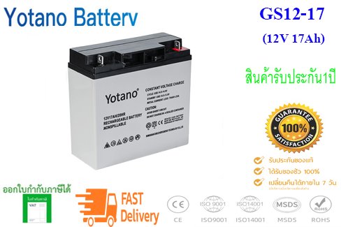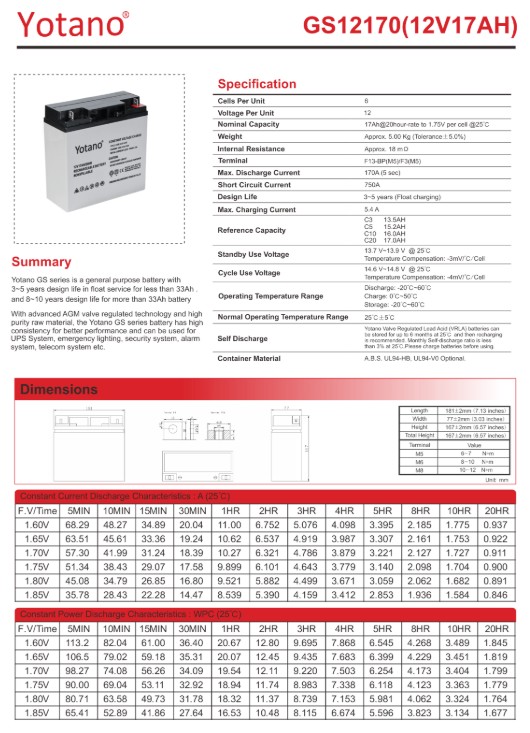 1.ขนาด ยาว(L) 181 กว้าง(W) 76, สูง(H) 167 สูงสุด(TH)167(mm) 2.แบตเตอรี่ รุ่น GS12-17 (12V ,17AH) (หัวขั้วF1/F2) ระบบสำรองไฟฟ้า เป็นแบต VRLA ("การใช้งานสแตนด์บาย"
