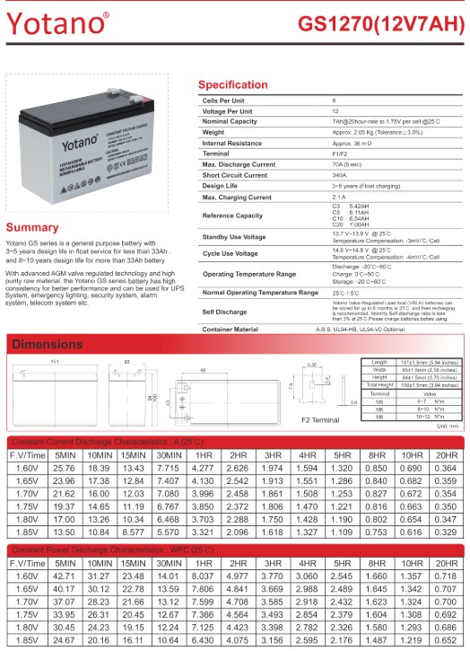 1.ขนาด ยาว(L) 151 กว้าง(W) 65, สูง(H) 95 สูงสุด(TH)100(mm) 2.แบตเตอรี่ รุ่น GS12-7 (12V ,7AH)หรือ GS12-7.2 (12V 7.2AH)(หัวขั้วF1/F2) ระบบสำรองไฟฟ้า เป็นแบต VRLA ("การใช้งานสแตนด์บาย"