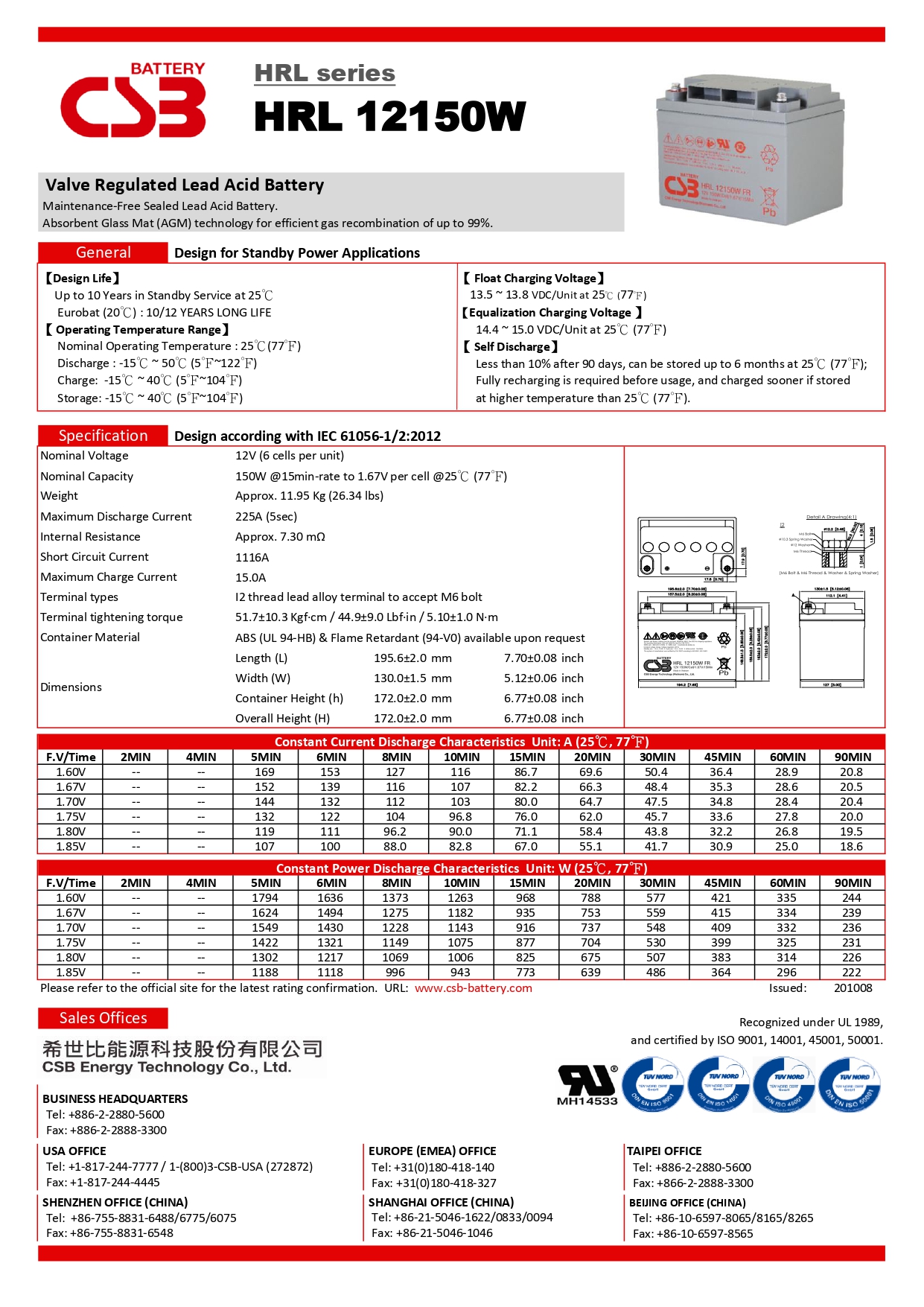 CSB แบตเตอรี่เครื่องสำรองไฟ รุ่น HRL12150W FR (12V,150W) ใช้สำรองไฟฟ้าหรือ UPS ทุกรุ่น ขอใหม่แท้100%