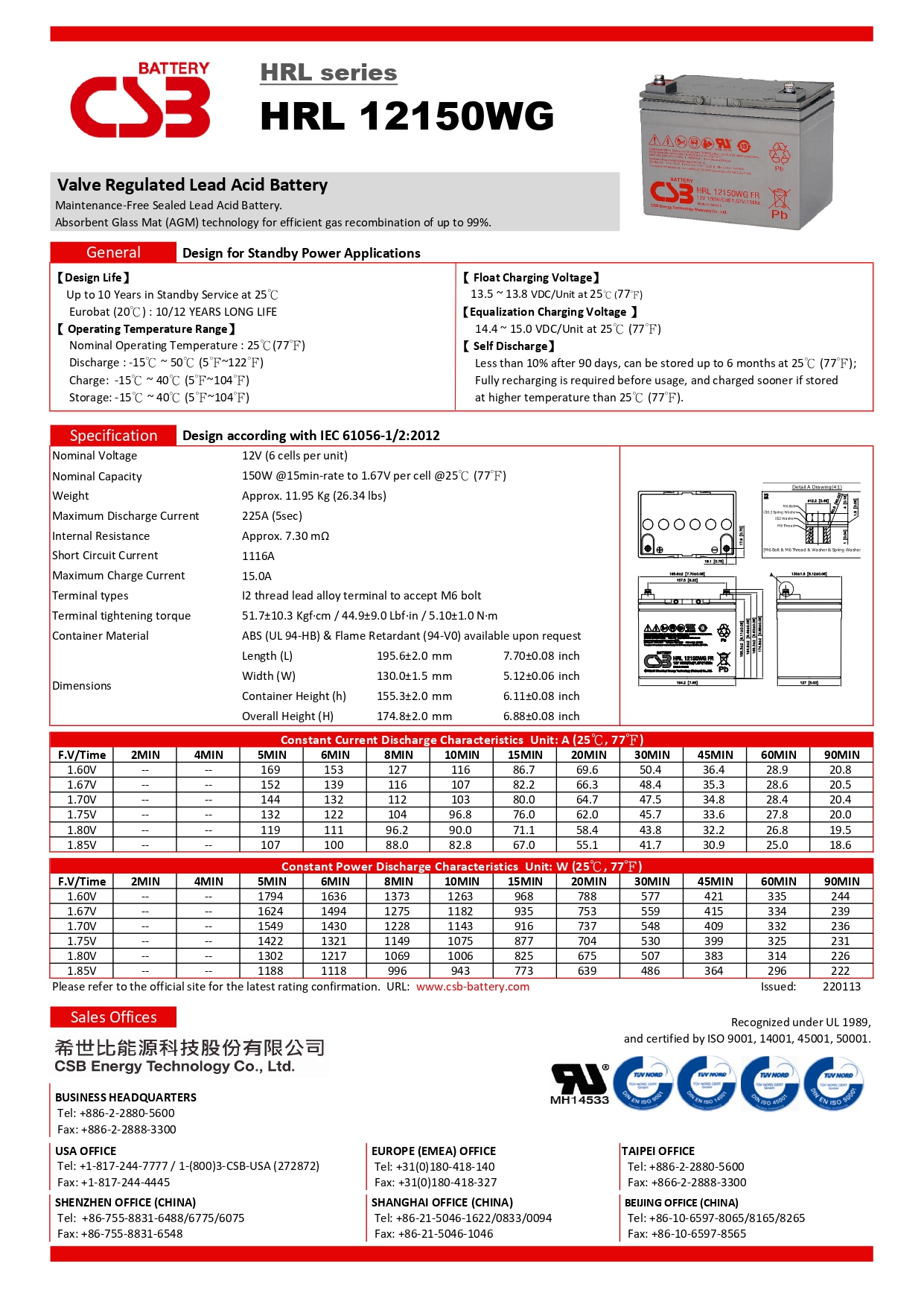 CSB แบตเตอรี่เครื่องสำรองไฟ รุ่น HRL12150WG FR (12V,150W) ใช้สำรองไฟฟ้าหรือ UPS ทุกรุ่น ขอใหม่แท้100%
