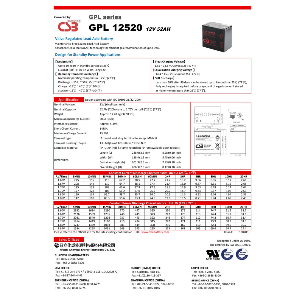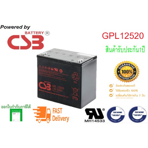 1.รุ่น GPL12520 (12V, 52AH) 2. ขนาด(กว้าง 13.84, ยาว 22.8, สูง 21.03) 3.แบตเตอรี่ประเภท Vale Regulated Lead Acid Battery (VRLA) หรือ Sealed lead Acid Battery (SLA) หรือBattery โดยผู้ผลิต คือ Hitachi Chemical Energy and Technology Co., Ltd. ซึ่งเป็นแบตเตอรี่เพื่อใช้ในอุตสาหกรรมระบบสำรองไฟ ทุกประเภท ซึ่งเป็นที่รู้จักกันอย่างแพร่หลายทั่วโลก 4.สินค้ารับประกัน1ปี 5.อายุการใช้งานสูงถึง 10 ปี หากท่านต้องการอัพเกรดให้ ระบบสำรองไฟฟ้า หรือ UPS ของท่านจ่ายไฟได้นานขึ้น Battery Shop ขอแนะนำ CSB รุ่น GPL12520 (12V, 52AH) คุณภาพดี ของแท้ 100%