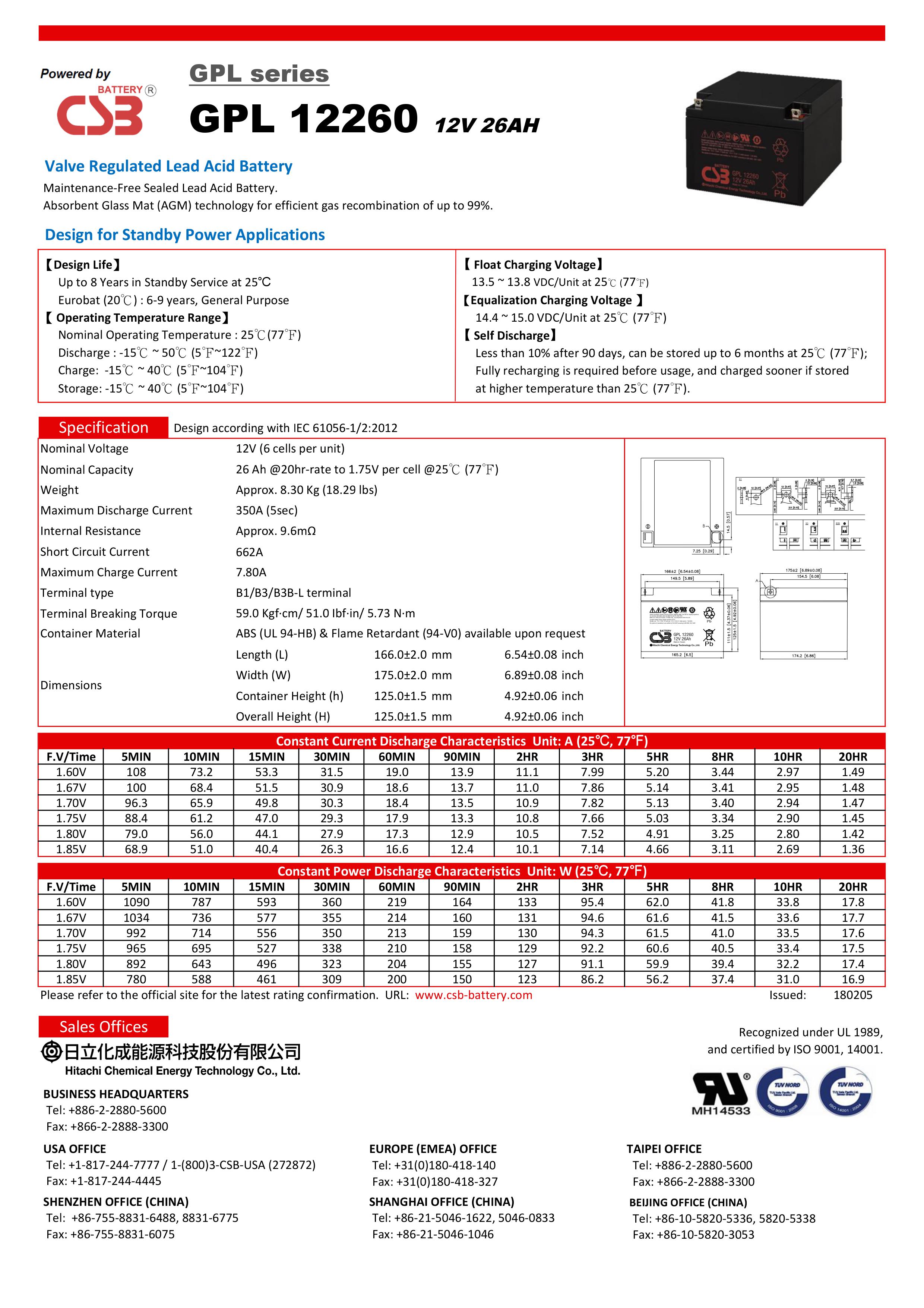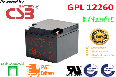 1.รุ่น GPL12260 (12V, 26AH) 2. ขนาด(กว้าง 16.6, ยาว 17.5, สูง 12.2) 3.แบตเตอรี่ประเภท Vale Regulated Lead Acid Battery (VRLA) หรือ Sealed lead Acid Battery (SLA) หรือBattery โดยผู้ผลิต คือ Hitachi Chemical Energy and Technology Co., Ltd. ซึ่งเป็นแบตเตอรี่เพื่อใช้ในอุตสาหกรรมระบบสำรองไฟ ทุกประเภท ซึ่งเป็นที่รู้จักกันอย่างแพร่หลายทั่วโลก 4.สินค้ารับประกัน1ปี 5.อายุการใช้งานสูงถึง 8 ปี หากท่านต้องการอัพเกรดให้ UPS ของท่านจ่ายไฟได้นานขึ้น Battery Shop ขอแนะนำ CSB รุ่น GPL12260 (12V, 26AH) คุณภาพดี สินค้าของแท้ 100%
