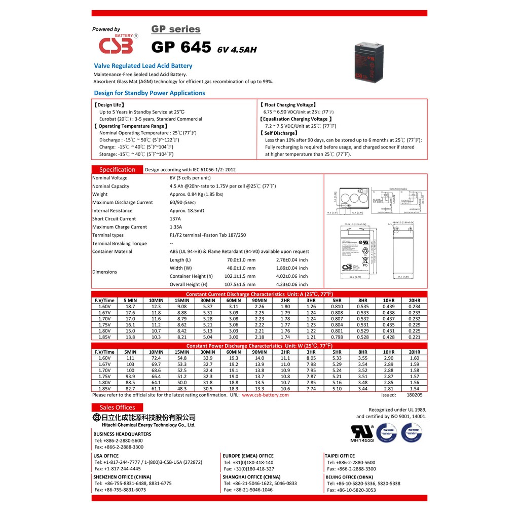 1.ขนาด กว้าง 4.8, ยาว 7, สูง 10.2 (ซม) 2.น้ำหนัก 0.84 kg 2.แบตเตอรี่ รุ่น GP645 6V,4.5AH ระบบสำรองไฟฟ้า เป็นแบต VRLA ("การใช้งานสแตนด์บาย" - พลังงานสำรอง: ส่วนใหญ่ใช้สำหรับไฟฉุกเฉินหรือUPSและอื่นๆ เพื่อหลีกเลี่ยงความเสียหายในอนาคตที่อาจเกิดจากไฟดับทันที) แบตแห้ง 3.ควรเก็บแบตไว้ในอุณภูมิ 25 จะยิ่งทำให้แบตมีอายุการใช้งานที่ยาวนานมากยิ่งขึ้น 4.รับประกันแบต 1ปี (กรณีที่แบตเสียเองที่ไม่ได้เกิดจากการทำเสียเองของตัวลูกค้า) 5.อายุการใช้งานสูงถึง 5 ปี