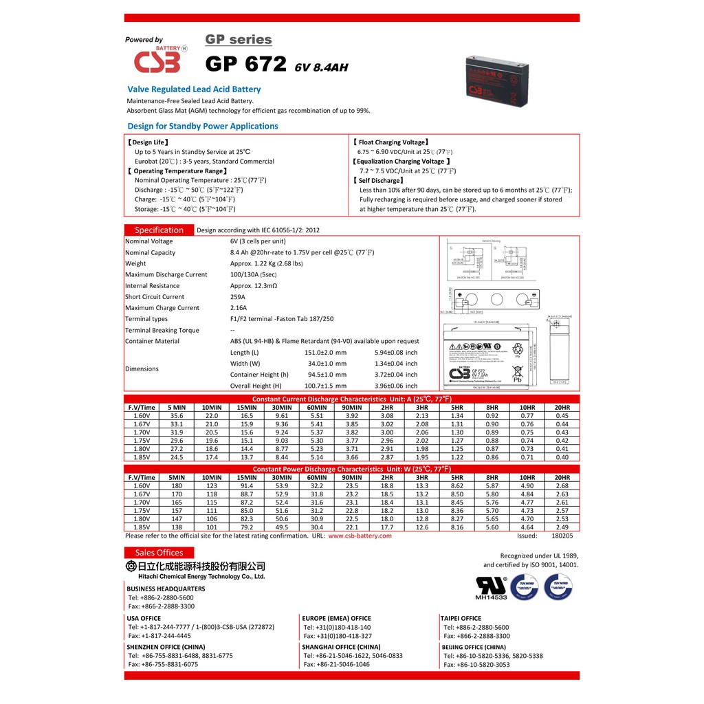 1.ขนาด กว้าง 3.4, ยาว 15.1, สูง 9.4(ซม) 2.แบตเตอรี่ รุ่น GP672 ( 6V,7.2AH ) ระบบสำรองไฟฟ้า เป็นแบต VRLA ("การใช้งานสแตนด์บาย" - พลังงานสำรอง: ส่วนใหญ่ใช้สำหรับไฟฉุกเฉินหรือUPSและอื่นๆ เพื่อหลีกเลี่ยงความเสียหายในอนาคตที่อาจเกิดจากไฟดับทันที) แบตแห้ง 3.ควรเก็บแบตไว้ในอุณภูมิ 25 จะยิ่งทำให้แบตมีอายุการใช้งานที่ยาวนานมากยิ่งขึ้น 4.รับประกันแบต 1ปี (กรณีที่แบตเสียเองที่ไม่ได้เกิดจากการทำเสียเองของตัวลูกค้า) 5.อายุการใช้งานสูงถึง 5 ปี หากท่านต้องการอัพเกรดให้ UPS ของท่านจ่ายไฟได้นานขึ้น Battery Shop ขอแนะนำ CSB GP672 ( 6V,7.2AH ) คุณภาพดี