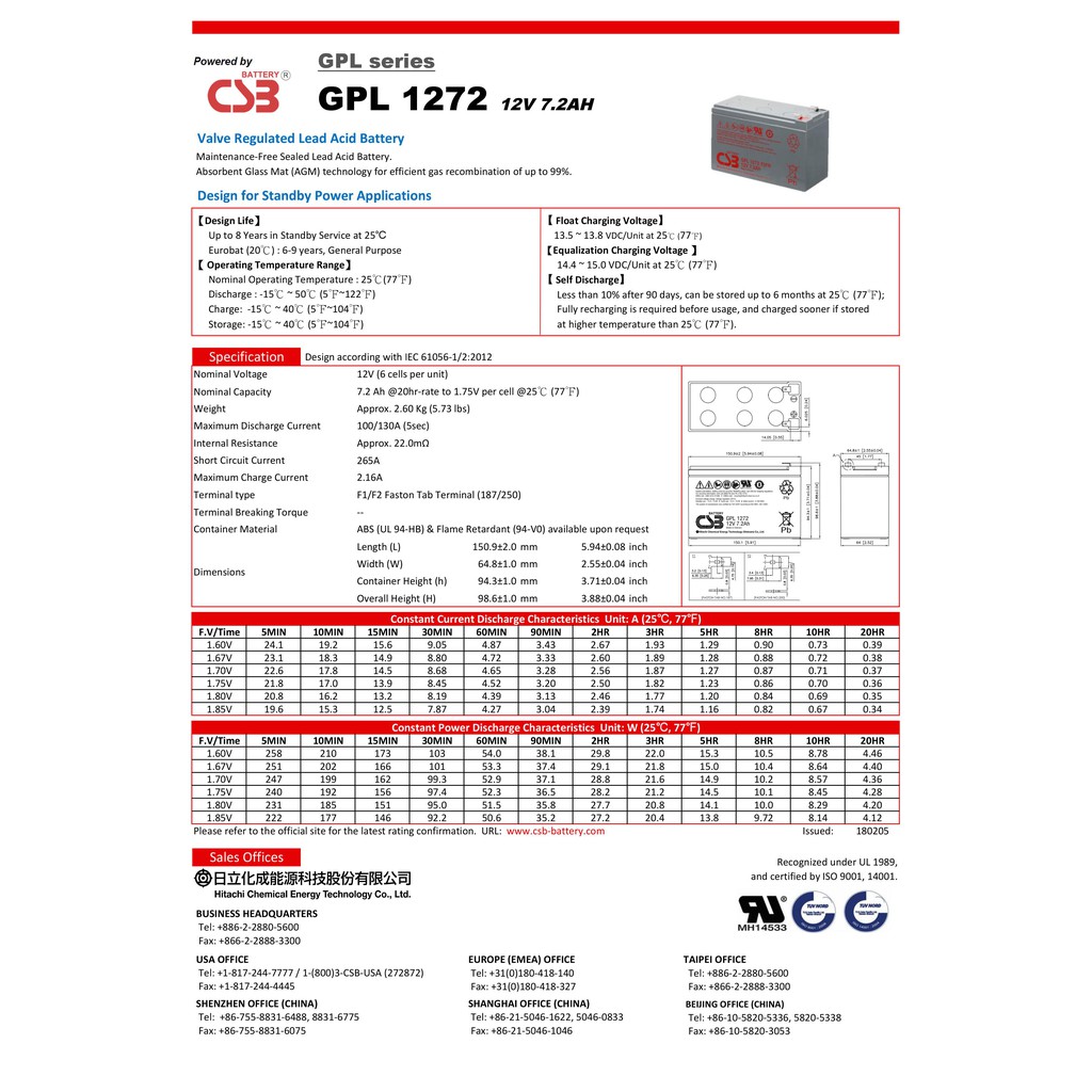 1.รุ่น GPL1272 F2FR (12V 7.2AH ) 2. ขนาด(กว้าง 6.5, ยาว 15.1, สูง 9.4) 3.แบตเตอรี่ประเภท Vale Regulated Lead Acid Battery (VRLA) หรือ Sealed lead Acid Battery (SLA) หรือBattery โดยผู้ผลิต คือ Hitachi Chemical Energy and Technology Co., Ltd. ซึ่งเป็นแบตเตอรี่เพื่อใช้ในอุตสาหกรรมระบบสำรองไฟ ทุกประเภท ซึ่งเป็นที่รู้จักกันอย่างแพร่หลายทั่วโลก 4.สินค้ารับประกัน1ปี 5.อายุการใช้งานสูงถึง 8 ปี 6.ตัว body แบบป้องกันไฟไหม้ คุณภาพสูง หากท่านต้องการอัพเกรดให้ UPS ของท่านจ่ายไฟได้นานขึ้น Battery Shop ขอแนะนำ CSB รุ่น GPL1272FR (12V 7.2AH ) คุณภาพดี สินค้าของแท้ 100%