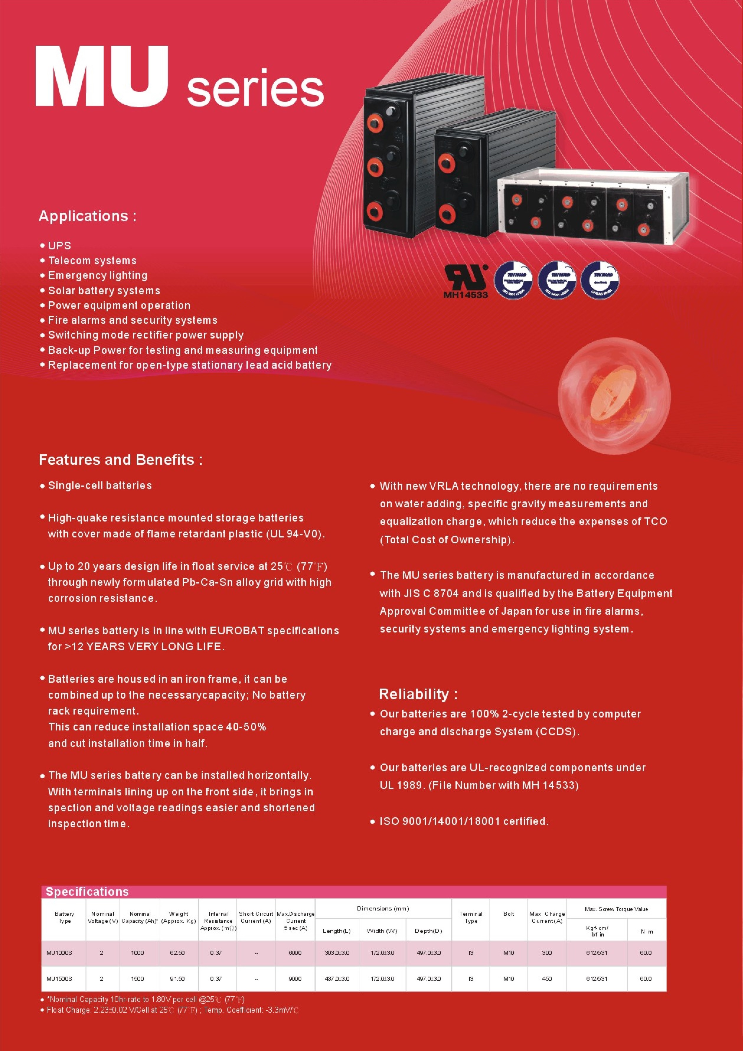 MU SERIES MU ซีรี่ย์เป็นแบตเตอรี่ความจุขนาดใหญ่และอายุการใช้งานที่ยาวนานพร้อมอายุการใช้งานที่ยาวนานถึง 20 ปีในโหมดสแตนด์บาย ช่วงความจุอยู่ระหว่าง 1,000Ah ถึง 1500Ah ของแบตเตอรี่ 2V และทั้งหมดเป็นแบบชาร์จไฟประสิทธิภาพสูงป้องกันการรั่วและการบำรุงรักษาฟรี
