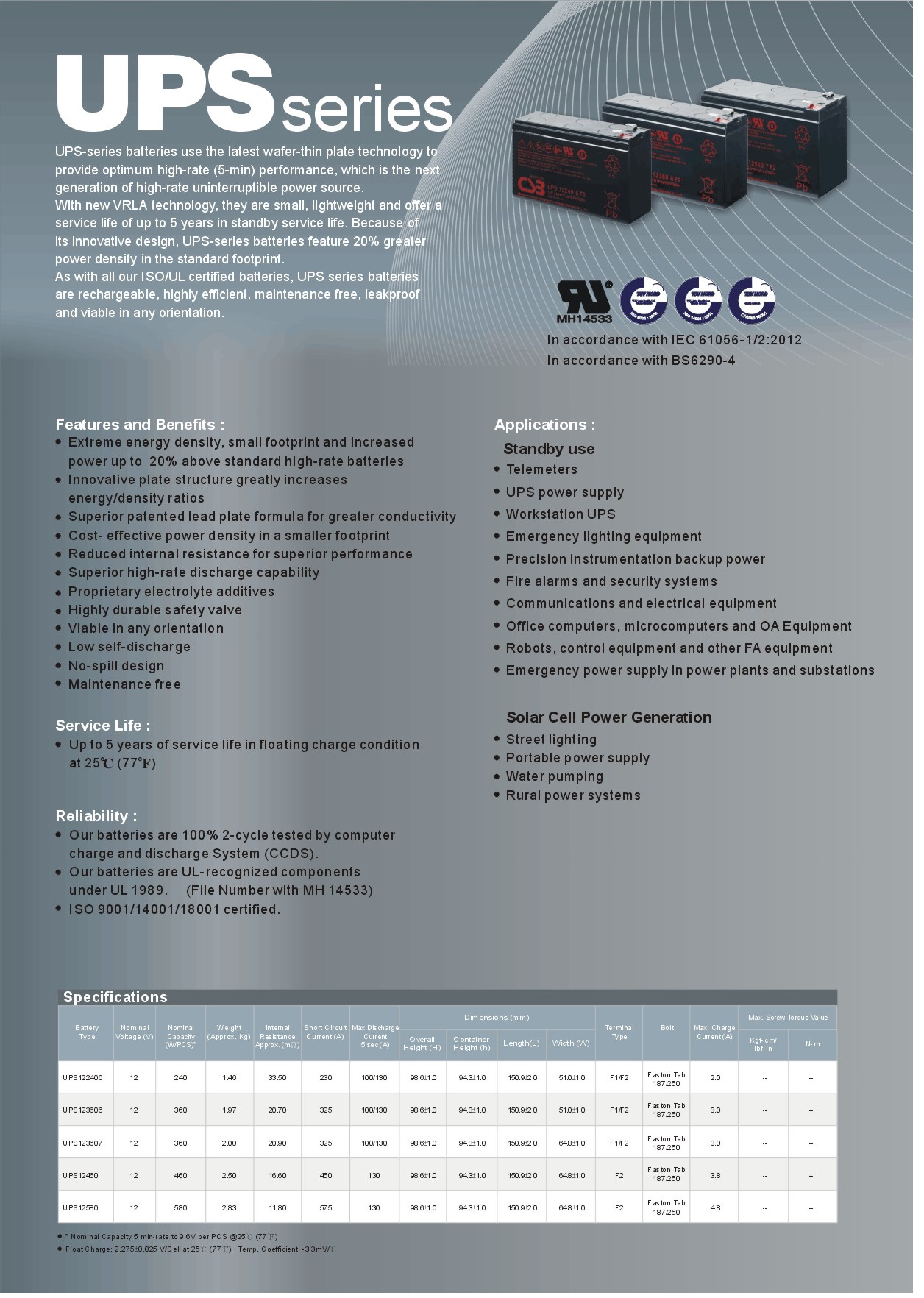 UPS SERIES UPS ซีรี่ส์ออกแบบมาเป็นพิเศษสำหรับการใช้งานที่มีประสิทธิภาพสูง มันใช้เทคโนโลยีแผ่นเวเฟอร์บางล่าสุดเพื่อมอบประสิทธิภาพที่สูงในอัตราสูงพร้อมอายุการออกแบบสูงสุด 5 ปีในบริการสแตนด์บาย ช่วงกำลังการผลิตจาก 240W / แบตเตอรี่ถึง 580 W / แบตเตอรี่ 12V แบตเตอรี่เป็นเวลา 5 นาทีและทั้งหมดเป็นแบบชาร์จไฟประสิทธิภาพสูงป้องกันการรั่วและการบำรุงรักษาฟรี